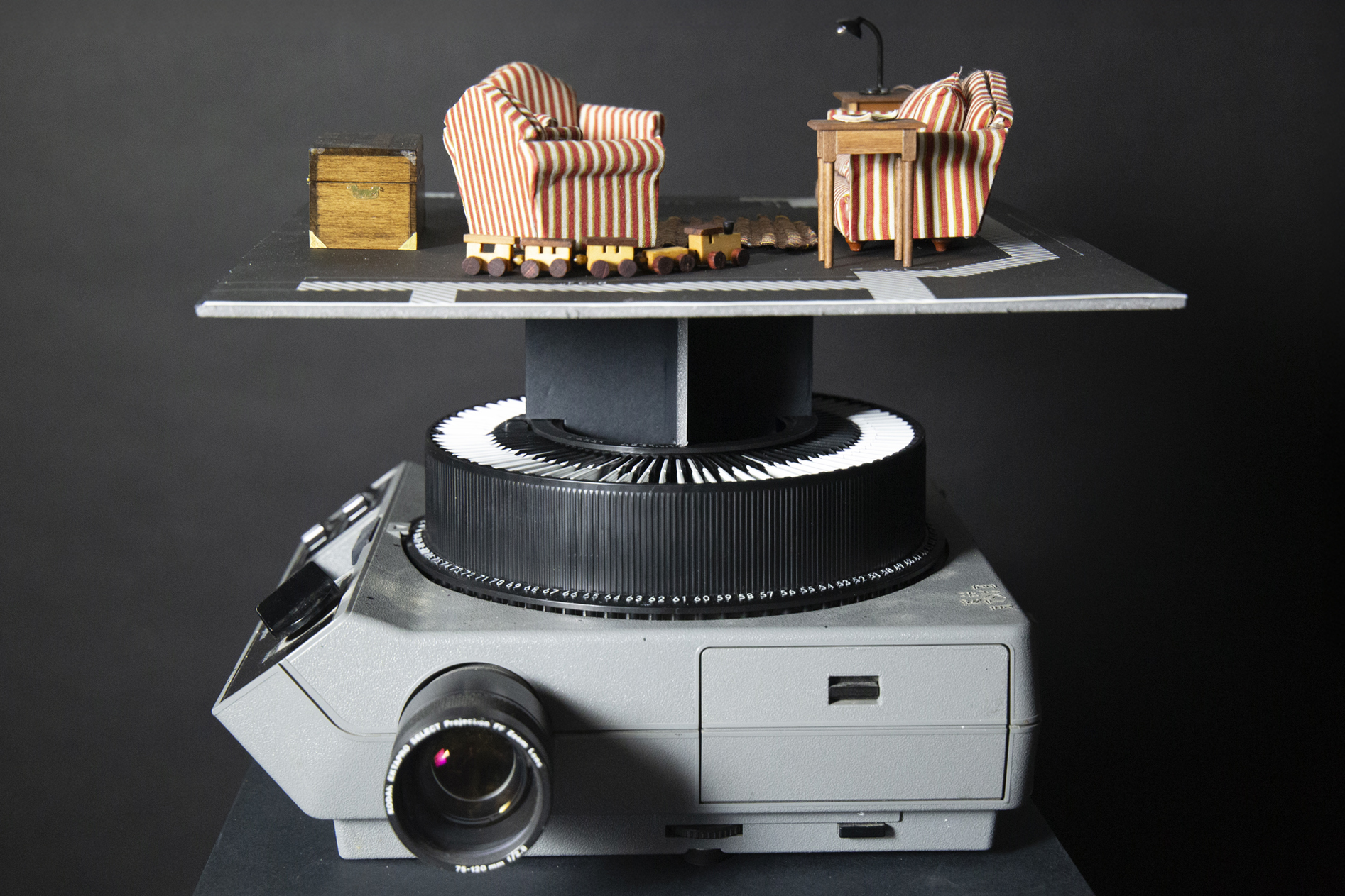 Slide projectors, acetate slides, foamcore, dollhouse furniture